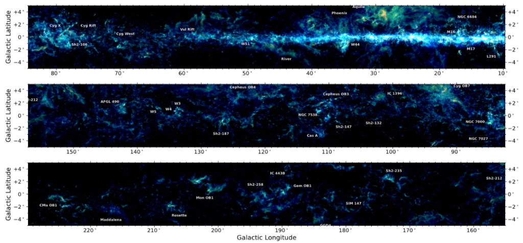 中国科学院紫金山天文台12月11日通报,我国“银河画卷”(MWISP)巡天计划当日正式公布首批毫米波分子谱线观测数据。古代诗词、典籍中常以“汉”诗意命名的银河,如浩瀚卷轴被徐徐展开,由中国天文学家铺陈在世界面前。  “银河画卷”三种一氧化碳同位素谱线数据合成的红、绿、蓝三色图。图中标识了著名的恒星形成区或气体结构,显示了不同密度环境下的大尺度气体结构和形态各异的分子云细节。(中国科学院紫金山天文台供图)“银河画卷”项目首席科学家、紫金山天文台研究员杨戟介绍,此次公布的数据覆盖北天银道面附近(银经10至230度,银纬±5度)约2300平方度天区,通过探测星际一氧化碳分子气体发出的毫米波信号,高精度描绘出银河系分子气体的分布与结构。自2011年起,该计划历时十余年,此前已完成一期巡天。此次公布的数据共包括科研团队累计获取的超过1亿条谱线数据。利用这些数据,科研团队构建了目前最完备的毫米波CO分子谱线数据库,为银河系研究提供了前所未有的全景视角。