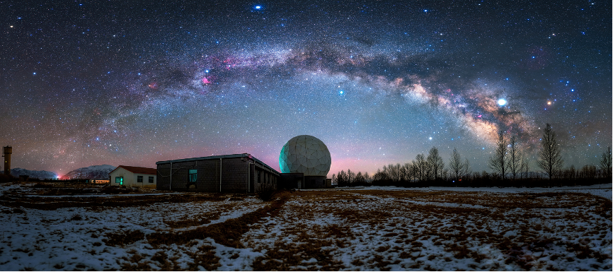 图:璀璨星空银河下的青海观测站13.7米毫米波望远镜(照片来源:骑驴到西藏)