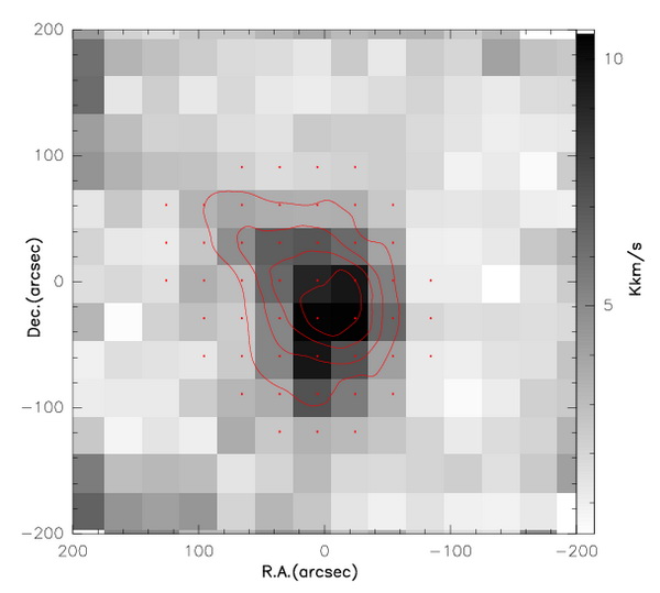 Fig2. Comparison of classical grid mapping and OTF mode. The background grey-scale map is the result of OTF observation and the read isogram is the result of grid mapping mode, and the isogram intensity is 3,5,7,9 Kkm/s.