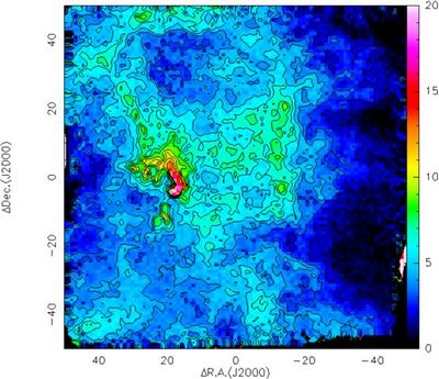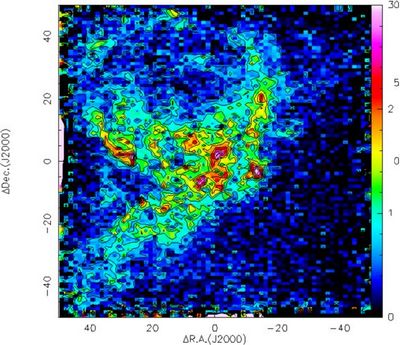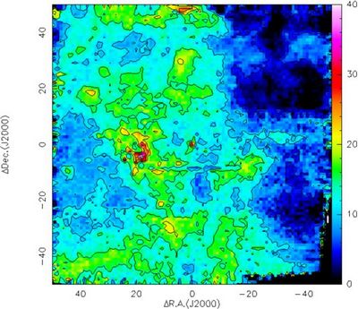 (1)CO(1-0) integrated intensity map(The unit of the map is arcminute,the integrated intensity is shown by color in the unit of K km/s):