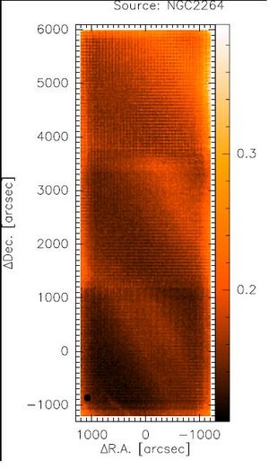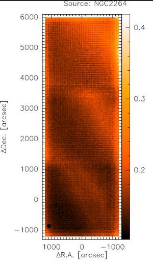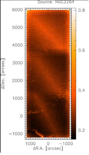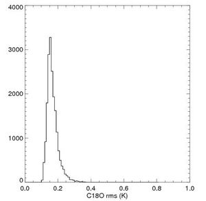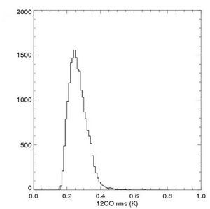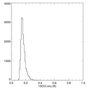 (image or by WU Yuan Wei) Fig.5 Top, middle and below are rms distributions for 12CO(1-0)、13CO(1-0) and C18O(1-0). The reason for the double peak profile is that rms in the bottom region of NGC2264 are larger than the middle and top region. |