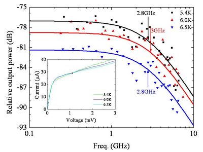 Fig. 1 Measured gain bandwidth at the same DC bias point but different bath temperatures. Bath temperatures are 5.4, 6 and 6.4 K, respectively. The inset shows the I-V curves at different bath temperatures, intersection point of which is the DC bias point for gain bandwidth measurement.