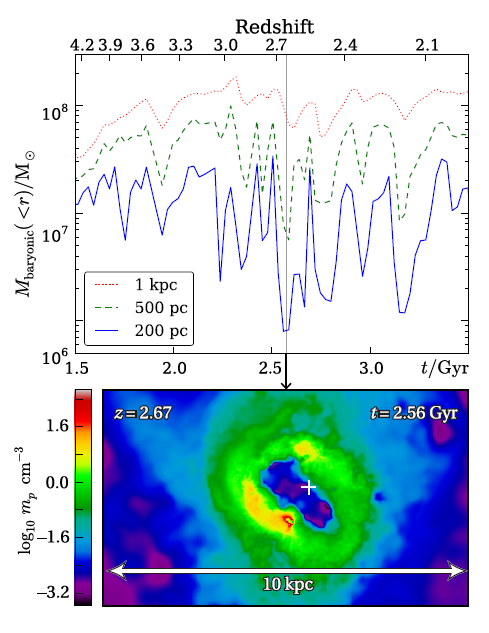 (Main panel) The baryonic mass interior to, from top line to bottom, 1kpc, 500pc and 200pc (HT simulation). Bursty central star formation coupled to strong supernova feedback causes coherent, rapid oscillations in the potential interior to 1kpc. The orbital time of typical dark matter particles interior to 1kpc is & 25Myr. By contrast the simulated supernova bubbles can encompass the inner kiloparsec in around 3Myr, far too rapidly for the adiabatic approximation to be valid. The lower panel shows the disk-plane density during the starburst event at t = 2:56Gyr, z = 2:67. A large underdense bubble has formed at the centre of the disk through thermal expansion of gas heated by multiple supernova explosions. The cross marks the halo centre.