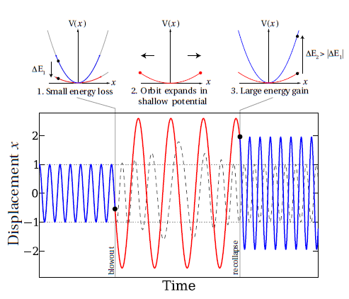 The mechanism for injecting energy into the dark matter orbits, illustrated by the exact solution for a time-varying harmonic oscillator potential. The lower panel shows (solid line) a solution to the equations of motion where !2 = 1 (blue) at early and late times, while at intermediate times !2 = 0:1 (red) mimicking baryonic blowout and recondensation. The changes in potential occur instantaneously; in this case the final amplitude of the oscillation is approximately twice that of the initial orbit. The dashed line shows the solution when the potential changes smoothly over several orbital periods; this gives adiabatic behaviour, so that the final orbit regains the initial amplitude, demonstrating the necessity for relatively sudden potential jumps. The inset figures (top) illustrate how the post-blowout orbit expansion implies that the late-time energy gain dominates over the initial energy loss. We propose and successfully test a novel physical model explaining the origin of cored dark matter density profiles, motivated by recent numerical simulations of dwarf galaxies. In the simulations, the potential in the central kiloparsec repeatedly fluctuates on sub-dynamical timescales over the redshift interval 4 > z > 2 because energetic feedback generates large underdense bubbles from recurrent, centrally-concentrated bursts of star formation. These fluctuations are shown to be responsible for generating a core. Analytic models are presented which describe how particles orbiting in such rapidly fluctuating gravitational potentials gain energy. We proceed from first principles, breaking with a historical reliance on adiabatic approximations which are inappropriate in the rapidly-changing limit. In the new picture, outflows and galactic fountains can both give rise to cusp-flattening. Concentrations of baryons undergoing cycles of rapid expansion and recollapse are the essential ingredient. Constant density dark matter cores should therefore be generated in systems of a wide mass range if central starbursts or AGN phases are sufficiently frequent and energetic. See the webside for more details.http://arxiv.org/abs/1106.0499 (SY) |