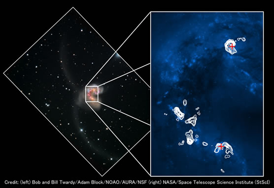 The contours on the right figure show the SMA data obtained and analyzed by the group. Can a galaxy collision trigger massive bursts of star formation? or is it related to the growth of a super-massive black hole? In an attempt to answer these intriguing scientific questions, an international team led by researchers at the NAOJ Nobeyama and the University of Tokyo observed the nearest colliding galaxy pair from the Earth, the “Antennae galaxies”, using the Submillimeter Array (SMA) in Hawaii. The team used the SMA to map the relatively warm and dense molecular gas cloud - the exact fuel for future star formation and black hole growth - at an angular resolution that is more than 10 times higher than previously possible. “What was only seen as a blurred picture before has now become increasingly sharp, thanks to the high resolution power offered by the SMA” says Junko Ueda who is a graduate student at the University of Tokyo and the principal investigator of the team. The team used this new image to identify regions in the Antennae galaxies that do not show clear signs of star clusters in optical images, but have ample amounts of molecular gas clouds. These are regions that will possibly host numerous star clusters in the future, and the intense bursts of star formation could be triggered by the immense galaxy collision. The high quality SMA image also shows new hints of gas streaming to the central region of the galaxy, which may be related to the growth of the central super massive black hole. Astronomers believe that many of the galaxies in the universe host black holes at galaxy centers. See the webside for more details:http://www.nao.ac.jp/E/release/2011/11/22/galaxy-collisions.html (SY) |