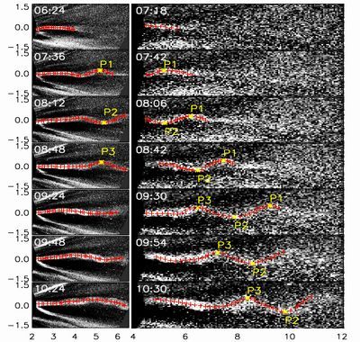 The Kelvin–Helmholtz instability (KHI), driven by a shear of the flow velocity, has been observed in various astrophysical environments. Shear-flow-driven instability can play an important role in energy transfer processes in the solar coronal plasma. Dr. Li Feng and her collaborators for the first time present the observation of a kink-like oscillation of a streamer that is probably caused by the streaming kink-mode Kelvin–Helmholtz instability (KHI). The wave-like behavior of the streamer was observed by the Large Angle and Spectrometric Coronagraph Experiment C2 and C3 on board the SOlar and Heliospheric Observatory. The free energy driving the instability is supplied by the sheared flow and sheared magnetic field across the streamer plane. The authors also estimated the plasma properties of the local environment of the streamer from the phase speed and instability threshold criteria. This work was published on Astrophysical Journal on September 10 2013 (774, 141), and was supported by MSTC Program 2011CB811402, NSFC under grants 11003047, 11233008, 11273065 and German DLR contract 50 OC 1301. By with FENG li Some selections of the traced streamer in oscillation by LASCO C2 and C3 coronagraph images. The yellow asterisks mark the crests and trough along the streamer.