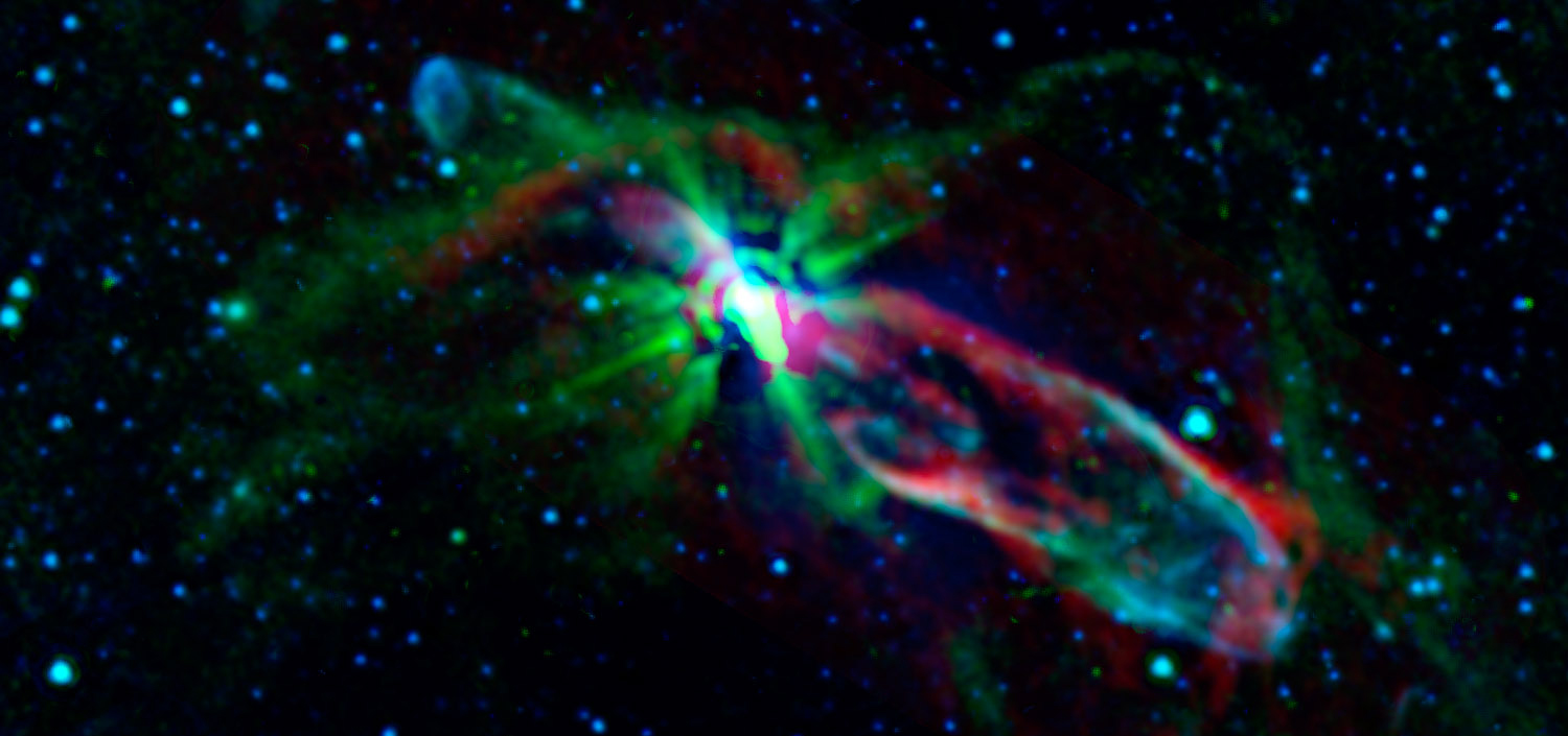 Combined observations from NASA's Spitzer Space Telescope and the newly completed Atacama Large Millimeter/submillimeter Array (ALMA) in Chile have revealed the throes of stellar birth, as never before, in the well-studied object known as HH 46/47. It's a bouncing baby . . . star! Combined observations from NASA's Spitzer Space Telescope and the newly completed Atacama Large Millimeter/submillimeter Array (ALMA) in Chile have revealed the throes of stellar birth as never before in the well-studied object known as HH 46/47. The Spitzer observations show twin supersonic jets emanating from the central star that blast away surrounding gas and set it alight into two bubbly lobes. HH 46/47 happens to sit on the edge of its enveloping cloud in such a way that the jets pass through two differing cosmic environments. The rightward jet, heading into the cloud, is plowing through a "wall" of material, while the leftward jet's path out of the cloud is relatively unobstructed, passing through less material. This orientation serves scientists well by offering a handy compare-and-contrast setup for how the outflows from a developing star interact with their surroundings. For a little more insight into the project see this: http://www.nasa.gov/mission_pages/spitzer/news/spitzer20131111.html