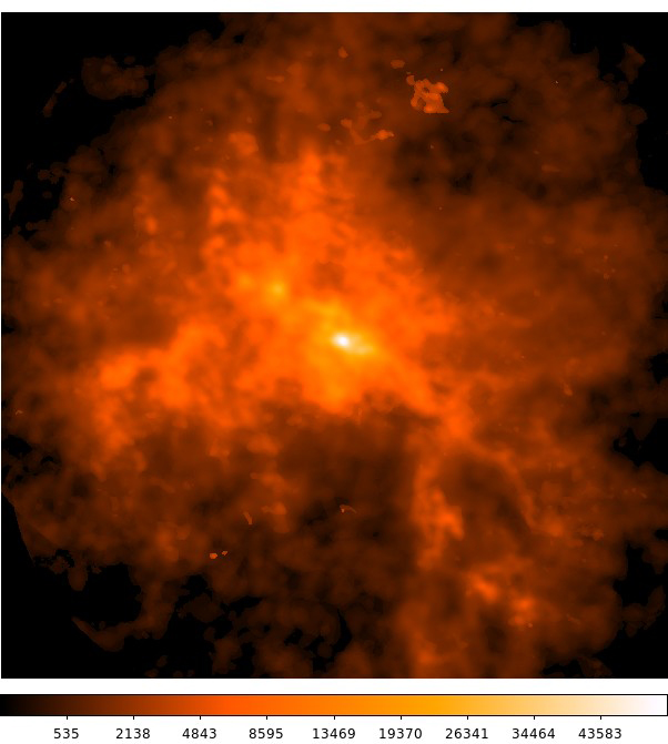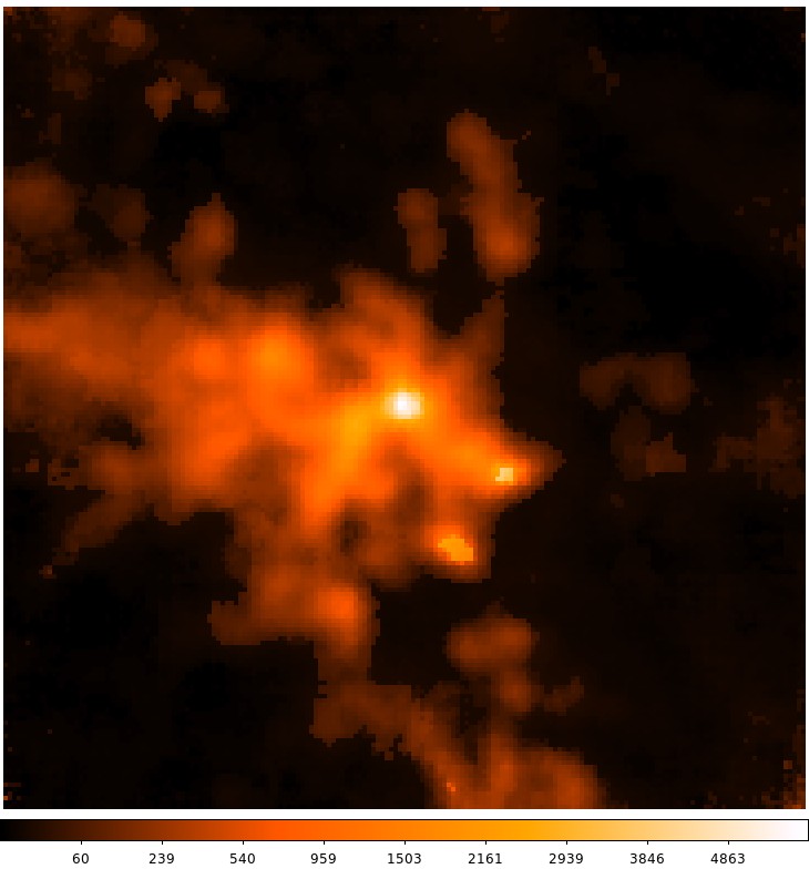 The column density of molecular gas in the 3 light year central region of W49A. The brightest region has a size less than 3 light years, but contains molecular gas of more than 105 solar mass.