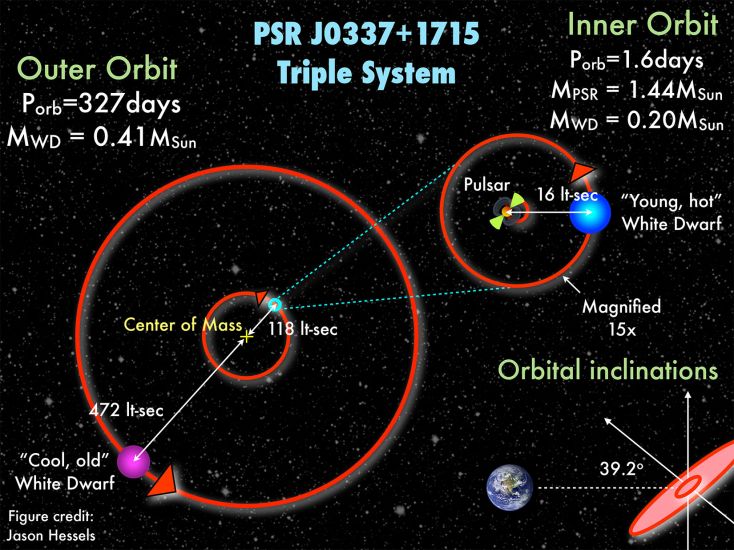 The necessary data came from an intensive observational program using several of the world's largest radio telescopes: the GBT, the Arecibo radio telescope in Puerto Rico, and ASTRON's Westerbork Synthesis Radio Telescope in the Netherlands. The team reports their findings in the online edition of Nature on January 5 and will present them at the 223rd meeting of the American Astronomical Society in Washington DC on January 6. For a little more insight into the project see this: http://www.astron.nl/about-astron/press-public/news/gravity-lab-discovered/gravity-lab-discovered-pulsar-unique-triple-st