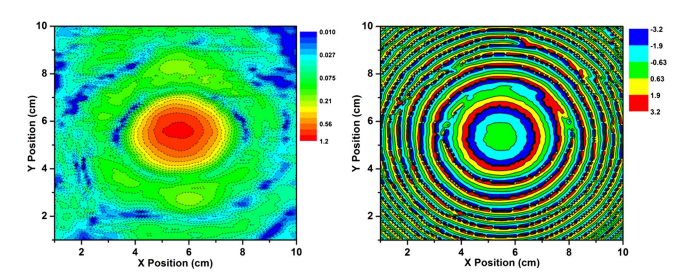 Fig1. Measured near-field amplitude (left) and phase (right) distributions at 850 GHz. Note that the signal source is 500 mm away from the HEB mixer In order to characterize the performance of this superconducting HEB mixer, a series of experiments have been performed in Millimeter and Sub-Millimeter Lab of Purple Mountain Observatory. The double-sideband receiver noise temperature was measured by ZHOU Kangmin and MIAO Wei , and is 600 K at 1.3 THz which can be as low as 300 K with the optical losses corrected. The intrinsic frequency response of the HEB mixer was measured by ZHOU Kangminand LI Shaoliang , it shows a high coupling efficiency in the frequency range of 0.8~1.5 THz, in good agreement with the simulated coupling efficiency of the twin-slot antenna. The far-field beam pattern of the HEB mixer, measured by ZHOU Kangmin, LOU Zheng and Jie HU, agrees well with the simulated one. The coupling efficiency between the measured beam pattern and a fundamental-mode Gaussian beam is 0.98 and 0.995 in E-plane and H-plane, respectively. All the results of our measurements have been published by IEEE Transactions on Applied Superconductivity, for a little more insight into this research see: http://ieeexplore.ieee.org/xpl/login.jsp?tp=&arnumber=6975136&url=http%3A%2F%2Fieeexplore.ieee.org%2Fxpls%2Fabs_all.jsp%3Farnumber%3D6975136 |