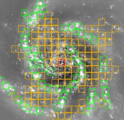 Fig. 2: Top: This plot is linking the depletion time and a specific combination of star formation rate (SFR) and stellar surface density. Each data point represents a grid cell of 1kpc x 1kpc size within different structures of the galaxies analysed. Bottom: The optical image of one of the galaxies in the sample, NGC 5457. Coloured squares show grids cells, with 1 kpc on a side, in the arm (green), interarm (yellow) and bulge (red) regions.