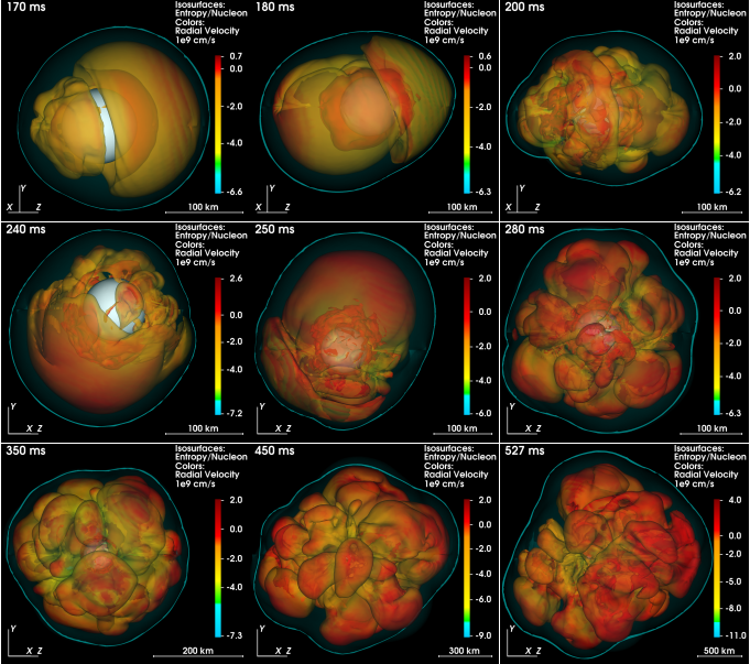 Fig. 1: Sequence of volume-rendering images that show the violent non-spherical mass motions that drive the evolution of the collapsing 20 solar-mass star towards the onset of a neutrino-powered explosion. The whitish central sphere indicates the newly formed neutron star, the enveloping bluish surface marks the supernova shock. (Visualization: Elena Erastova and Markus Rampp, Max Planck Computing and Data Facility (MPCDF)); copyright (2015) by American Astronomical Society).