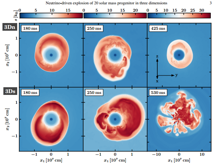 Fig. 2.— Cross-sectional entropy distributions (in kB per nucleon) for the 3D models without (3Dn; upper row) and with strangeness contributions (3Ds; bottom). The bottom row clearly shows stronger SASI activity in model 3Ds (180 ms, 250 ms), whose traces are still imprinted on the ejecta geometry after the onset of the explosion (530 ms; note the di erent scale).