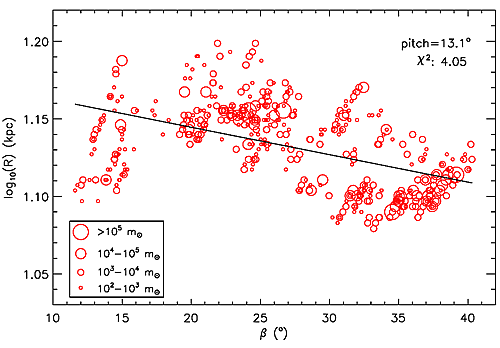 By DU Xinyu Fig.1. The Milky Way plan view. The red circles are the Outer arm molecular clouds. The red dashed curve indicates the fitting result of the Outer arm. And the red solid curve indicates the translationally moved result by taking the fitting result from Reid et al. (2014) into account. The article link:http://arxiv.org/abs/1602.08229 |