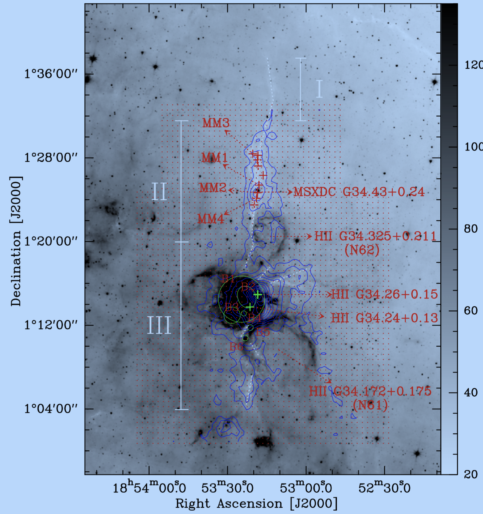 Combining data of PMO 13.7 m radio telescope and other archive data, authors from National Astronomical Observatory (NAO) and PMO performed a multi-wavelength study toward IRDC G34.43+0.24. They found that at 8 μm (Spitzer-IRAC), IRDC G34.43+0.24 appears to be a dark filament extended by 18‧ along the north-south direction. Based on the association with the 870 μm and C18O J = 1-0 emission, they suggest that IRDC G34.43+0.24 should not be 18‧ in length, but extend to 34‧. IRDC G34.43+0.24 contains some massive protostars. UC HII regions (G34.172+0.175), and infrared bubbles (N61 and N62). Both infrared bubbles N61 and N62 show a ringlike structure at 8 μm. N61 has a double-shell structure that has expanded into IRDC G34.43+0.24. The outer shell is traced by 8 μm and 13CO J = 1-0 emission, while the inner shell is traced by 24 μm and 20 cm emission. They suggest that the outer shell is created by the expansion of HII region . G34.172+0.175, while the inner shell may be produced by the energetic stellar wind of its central massive star. This paper has been published in ApJ, available at http://adsabs.harvard.edu/abs/2016ApJ...819..117X