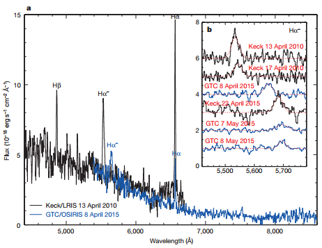 Figure 1. Keck and GTC spectra for the optical counterpart of M81 ULS-1. (a) The Keck/LRIS spectrum taken on 2010/04/13 (black) and the GTC/OSIRIS spectrum taken on 2015/04/08 (blue) for M81 ULS-1. Labeled over the lines are the broad Balmer lines (Ha and Hb), the very broad blue-shifted Ha? at 5530°A and 5648A° .