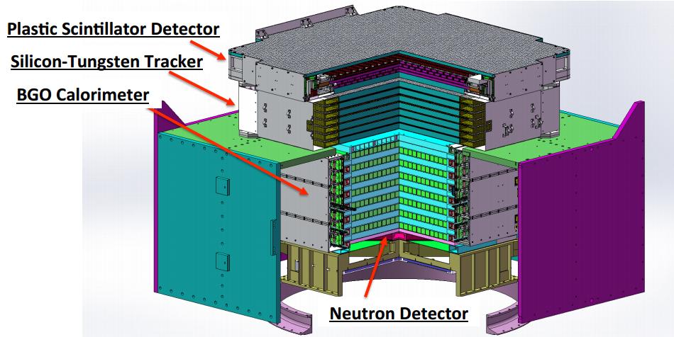 There are four payloads: a plastic scintillator detector, a silicon-Tungsten Tracker, a BGO calorimeter and a neutron detector.