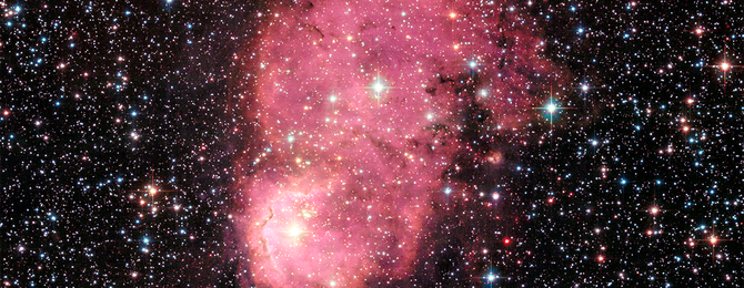 Two glowing nebulas in the Small Magellanic Cloud, a dwarf galaxy that is a satellite of our Milky Way galaxy, have been observed by NASA's Hubble Space Telescope. Young, brilliant stars at the center of each nebula are heating hydrogen, causing these clouds of gas and dust to glow red. The image is part of a study called Small Magellanic Cloud Investigation of Dust and Gas Evolution (SMIDGE). Astronomers are using Hubble to probe the Milky Way satellite to understand how dust is different in galaxies that have a far lower supply of heavy elements needed to create dust. See: http://hubblesite.org/news_release/news/2016-42 |