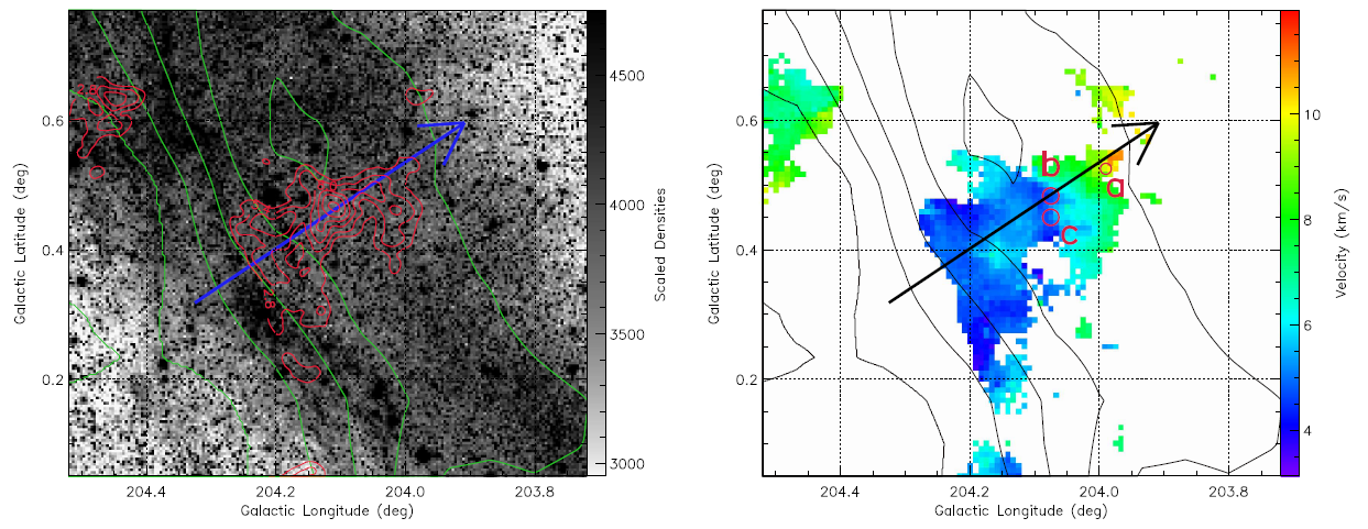 By with SU Yang Figure . Left panel: optical image (the Digitized Sky Survey, Lasker et al. 1990) toward the western boundary of SNR G205.5+0.5, overlaid with green radio contours as in Figure 1. Red contours show the 12CO (J=1–0) distribution (in units of K km s−1) integrated from 3 to 12kms−1. The arrow indicates the PV slice shown in Figure 7. Right panel: intensity-weighted 12CO (J=1–0) mean velocity (first moment) map of MCs in the interval of 3–12kms−1, overlaid with the same radio contours as in the left panel. Positions and sizes of shocked gas (see spectra in Figure 8) are also labeled. |