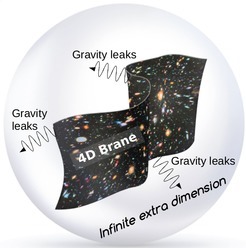 Figure 1:Schematic representation of the DGP brane model. Matter and radiation are confined to the four-dimensional brane, but the gravitational interaction is free to propagate out into the additional fifth dimension. See: http://www.mpa-garching.mpg.de/404826/hl201702 |