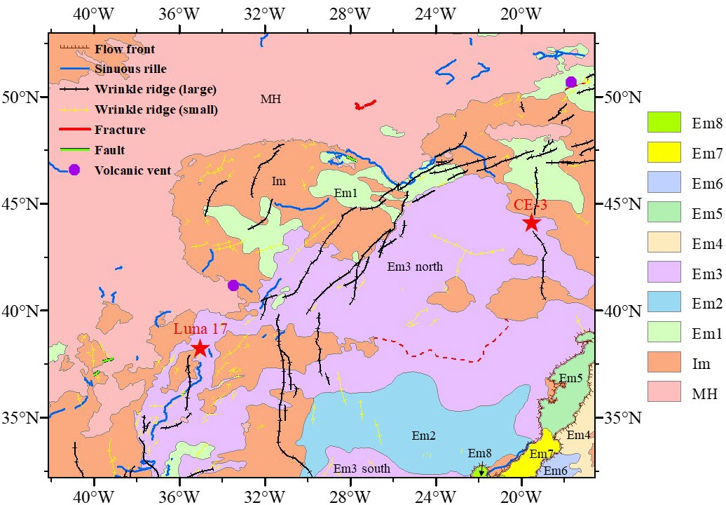 Fig. 1. Geologic map of the northwest Imbrium. Red dashed line marks sub-unit of Em3.