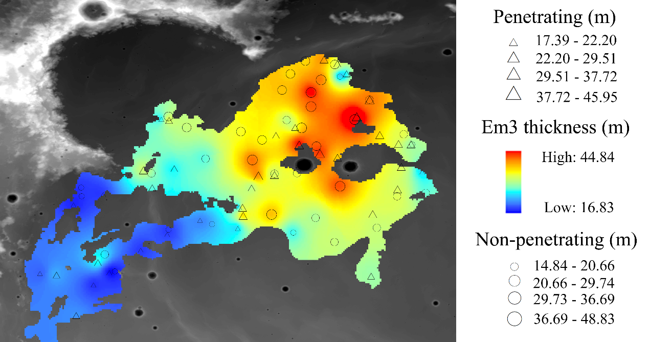 Employing the topographic profile analysis method for UEm and the crater excavation technique for LEm, we studied the thickness and distribution of Eratosthenian basalts in Mare Imbrium. The thickness of the Em3 unit ranges from ~17 m to ~45 m with lesser thickness to the west and greater thickness in the interior and to the east (Fig. 3). The estimated volume and average flux of the Eratosthenian-aged basalts are greater than previously thought.