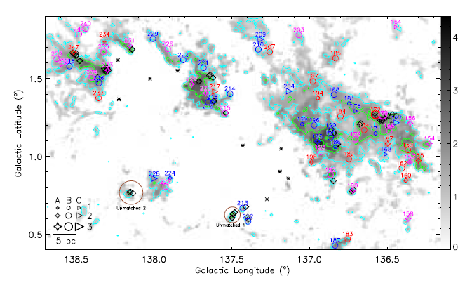 A total of 459 outflow candidates were detected, of which 284 were in the Perseus arm, 162 in the Local arm, 5 inthe Outer arm and 8 in interarm regions. This indicated that star formation was mainly concentrated to the Galactic spiral arms (especially the Perseusarm).There were a few cases of star formationoccurring in the interarm regions, and they were goodexamples to study relatively isolated star formation.The W3/4/5 complex in the Perseus arm, especially in the eastern high density layer (HDL) where the W3 complex neighbors the W4 complex, presented intensestar formation activities (see Figure 1). Most of the star formation in thesecomplexes were likely impacted by theHII regions surrounding them.The paper was published in the Astrophysical JournalSupplement Series (2019, ApJS, 242, 19).