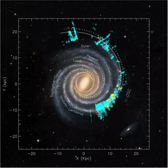 去年底,中国科学院紫金山天文台研究团队在天体物理学快报上发表了一项新成果,其团队基于“银河画卷”CO分子气体巡天数据更新了外银河系旋臂图像,拓展了对银河系的认知。新图像较以往同类观测扩大了约1.5倍。